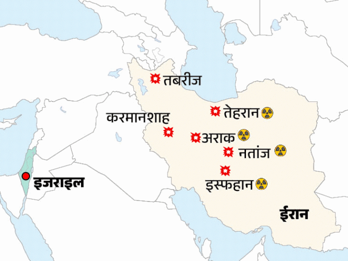 इजराइल ने शुक्रवार सुबह ईरान के एटमी और दूसरे सैन्य ठिकानों पर बड़ा हमला किया है। इसमें ईरान के 2 बड़े सैन्य अधिकारी और 2 परमाणु वैज्ञानिक मारे गए हैं। एक सीनियर ईरानी अधिकारी ने न्यूयॉर्क टाइम्स को बताया कि राजधानी तेहरान में शाहरक शाहिद महालती नामक जगह पर हमला हुआ। यहां पर हाई रैंक वाले ईरानी सैन्य अफसर रहते हैं। हमले में 3 इमारतें तबाह हो गई हैं। एक इजराइली सैन्य अधिकारी ने दावा किया कि ईरान गुपचुप तरीके से परमाणु हथियार बना रहा है और उसके पास कुछ ही दिनों में 15 परमाणु बम बनाने लायक सामग्री है। इसे रोकने के लिए यह हमला किया गया। नेतन्याहू बोले- ईरान हमारे लिए खतरा