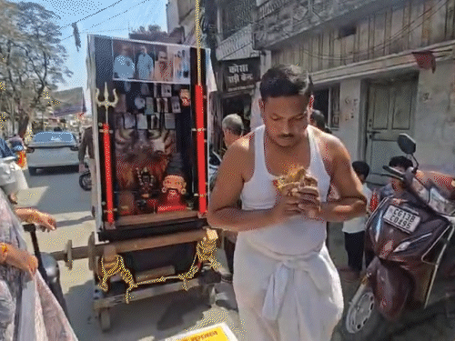 उधारी के 1.5 करोड़ लेने व्यापारी ने निकाली दंडवत यात्रा,VIDEO:रायगढ़ में रथ में देनदारों-भगवान की लगाई तस्वीरें, बोला- मां काली सपने में आई थी