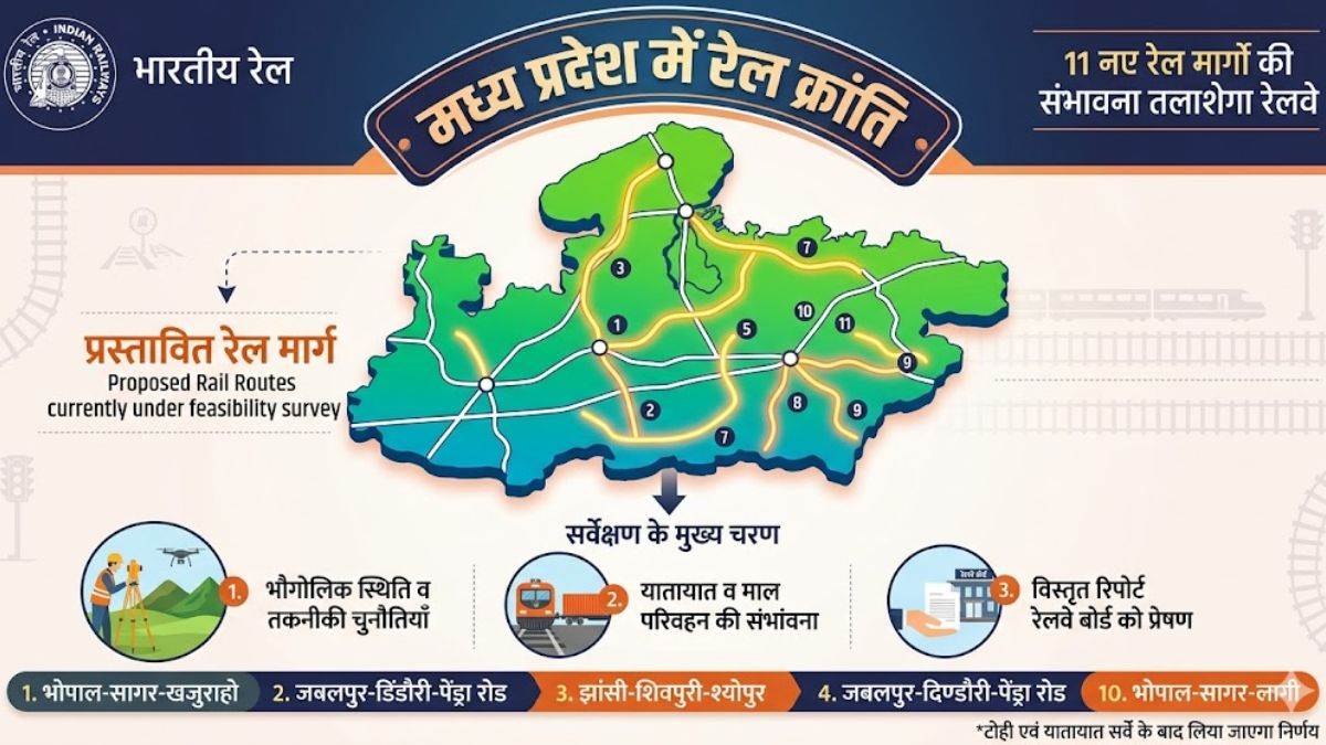 टॉप न्यूज़ एमपी में 11 नए रेल रूट की तैयारी… भोपाल से खजुराहो और जबलपुर से पेंड्रा रोड तक बिछेगी पटरी By Krishna - April 8, 2026 0 2 FacebookTwitterPinterestWhatsApp प्रदेश में रेल कनेक्टिविटी को मजबूत करने की दिशा में रेलवे ने बड़ा कदम उठाया है। रेलवे बोर्ड ने राज्य में 11 नए रेल मार्गों की संभावना तलाशने का निर्णय लिया है।