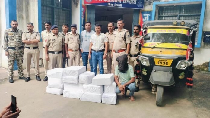 डिंडौरी पुलिस ने ऑटो रिक्शा से 114 लीटर अवैध अंग्रेजी शराब जब्त की, जिसकी कीमत 97 हजार रुपये है। आरोपित शैलेन्द्र उर्फ शैलू मथेस को गिरफ्तार किया गया है, जो दीपावली में बेचने के लिए शराब ले जा रहा था। आरोपी पुलिस को देखकर गाड़ी की चाबी फेंककर भागने की कोशिश करने लगा तो उसे घेराबंदी कर पकड़ लिया।