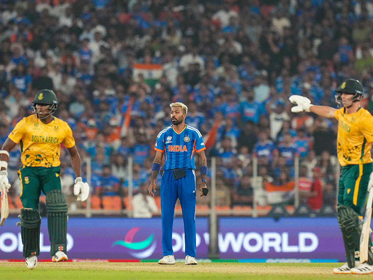 टी-20 वर्ल्ड कप 2026 में मेजबान भारत को पहली हार का सामना करना पड़ गया। रविवार को साउथ अफ्रीका ने टीम इंडिया को 76 रन के बड़े अंतर से हरा दिया। अहमदाबाद के नरेंद्र मोदी स्टेडियम में साउथ अफ्रीका ने 187 रन बनाए। भारत 111 रन ही बना सका। केशव महाराज ने एक ही ओवर में 3 विकेट झटक लिए। ओवर रेट पेनल्टी के कारण भारत को आखिरी ओवर में 5 खिलाड़ी 30 यार्ड सर्कल के अंदर खड़े करने पड़े। हार्दिक पंड्या ने रन आउट का मौका गंवाया, वहीं डेविड मिलर ने शिवम दुबे को जीवनदान दे दिया। IND vs SA मैच के टॉप मोमेंट्स… 1. भारत पर ओवर रेट की पेनल्टी लगी टॉस हारकर पहले बॉलिंग करने उतरी टीम इंडिया 20 ओवर पूरे करने के लिए निर्धारित 85 मिनट में 19 ओवर भी नहीं फेंक सकी। इस कारण टीम को आखिरी ओवर के लिए 4 की बजाय 5 खिलाड़ी 30 यार्ड सर्कल के अंदर खड़े करने पड़े। इसका खामियाजा भारत को भुगतना पड़ा और टीम ने 20वें ओवर में 20 रन खर्च कर दिए। 2. हार्दिक ने रन आउट का मौका गंवाया 20वें ओवर में हार्दिक पंड्या ने रन आउट का मौका भी गंवा दिया। ओवर की दूसरी गेंद हार्दिक ने यॉर्कर फेंकी, स्टब्स ने लॉन्ग ऑन की ओर गेंद पुश की और 2 रन के लिए दौड़ पड़े। स्टब्स तो स्ट्राइकर एंड पर पहुंच गए, लेकिन कगिसो रबाडा नॉन स्ट्राइकर एंड पर नहीं पहुंच पाए। फील्डर ने गेंद थ्रो की, लेकिन हार्दिक गेंद नहीं पकड़ पाए। अगर वे गेंद पकड़कर स्टंप्स को मार देते तो रबाडा आउट हो जाते। 3. स्टब्स ने 2 छक्के लगाकर खत्म की पारी साउथ अफ्रीका की बैटिंग के दौरान हार्दिक पंड्या गेंदबाजी से 20वां ओवर फेंकने आए। स्टब्स ने शुरुआती 2 गेंदों पर 2 डबल लिए, फिर तीसरी गेंद पर चौका लगा दिया। अगली गेंद लॉन्ग ऑफ की ओर गई, लेकिन स्टब्स ने रन नहीं लिया। उन्होंने फिर अगली 2 गेंदों पर छक्के लगाए और टीम का स्कोर 187 रन तक पहुंचा दिया। स्टब्स ने 24 गेंद पर 44 रन बनाए। 4. केशव महाराज को एक ओवर में 3 विकेट साउथ अफ्रीका के लेफ्ट आर्म स्पिनर केशव महाराज ने पारी के 15वें ओवर में 3 विकेट झटक लिए। तीनों विकेट कैच के रूप में रहे और हर बार कैच ट्रिस्टन स्टब्स ने ही पकड़ा। 5. डेविड मिलर ने शिवम दुबे का कैच छोड़ा भारत की बैटिंग के 16वें ओवर में शिवम दुबे को जीवनदान मिल गया। ओवर की पांचवीं बॉल कगिसो रबाडा ने ऑफ स्टंप के बाहर गुड लेंथ पर फेंकी। दुबे बड़ा शॉट लगाने गए, लेकिन गेंद कवर्स की दिशा में खड़ी हो गई। मिलर ने गेंद पकड़ने की कोशिश की, लेकिन गेंद उनके हाथ से छूट गई। जीवनदान के वक्त दुबे 32 रन के स्कोर पर थे, उन्होंने 42 रन बनाए।