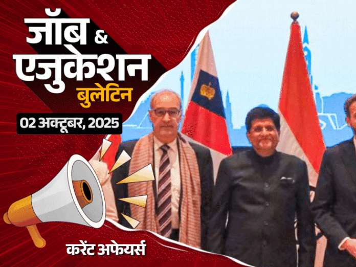 नमस्कार, आज टॉप जॉब्स में बात इंडियन आर्मी में ग्रुप-C भर्ती और UPSC की निकाली लेक्चरर्स और मेडिकल ऑफिसर्स की वैकेंसी की। करेंट अफेयर्स में चर्चा क्लासिकल सिंगर के निधन समेत अन्य खबरों की। टॉप स्टोरी में बात गुजरात सरकार के भर्ती कैलेंडर और NDA/NA रिटन एग्जाम रिजल्ट की। करेंट अफेयर्स 1. क्लासिकल सिंगर छन्नूलाल मिश्र का निधन शास्त्रीय गायक, पद्मविभूषण पंडित छन्नूलाल मिश्र का गुरुवार तड़के निधन हो गया। वे 89 साल के थे। उन्होंने सुबह 4.15 बजे बेटी नम्रता मिश्रा के मिर्जापुर स्थित घर पर अंतिम सांस ली। छन्नूलाल मिश्र का ‘खेले मसाने में होली…’ गीत आज भी हर किसी की जुबां पर है। 2. यशस्वी जायसवाल टाइम मैगजीन के टॉप-100 उभरते सितारों में शामिल टाइम मैगजीन ने भारतीय ओपनर यशस्वी जायसवाल को दुनिया के 100 उभरते सितारों की लिस्ट में शुमार किया है। जायसवाल 2025 TIME 100 Next में शामिल इकलौते क्रिकेटर हैं। 23 साल के इस बल्लेबाज ने बुधवार को सोशल मीडिया पोस्ट के जरिए इस लिस्ट में अपना नाम आने पर खुशी जाहिर की। 3. भारत-यूरोप के 4 देशों में फ्री ट्रेड एग्रीमेंट लागू भारत और यूरोप के चार देशों (स्विट्जरलैंड, नॉर्वे, आइसलैंड और लिकटेंस्टीन) के समूह EFTA के बीच हुआ फ्री ट्रेड एग्रीमेंट (FTA) 1 अक्टूबर से लागू हो गया। यह भारत का इन चार विकसित यूरोपीय देशों के साथ पहला FTA है। टॉप जॉब्स 1. इंडियन आर्मी में 194 पदों पर भर्ती इंडियन आर्मी ने ग्रुप-C के 194 पदों पर भर्ती का नोटिफिकेशन जारी किया है। इन पदों पर आवेदन ऑफलाइन माध्यम से स्वीकार किए जाएंगे। एजुकेशनल क्वालिफिकेशन : मान्यता प्राप्त बोर्ड से 10वीं, 12वीं पास या ITI की डिग्री। शारीरिक योग्यता : एज लिमिट : 2. UPSC के 213 पदों पर भर्ती की आखिरी तारीख संघ लोक सेवा आयोग (यूपीएससी) की ओर से लेक्चरर, मेडिकल ऑफिसर और अकाउंट्स ऑफिसर सहित 213 पदों पर भर्ती निकाली है। इस भर्ती के लिए आवेदन की आखिरी तारीख आज यानी 2 अक्टूबर तय की गई है। उम्मीदवार यूपीएससी की ऑफिशियल वेबसाइट upsc.gov.in पर जाकर ऑनलाइन माध्यम से आवेदन कर सकते हैं। एजुकेशनल क्वालिफिकेशन : पद के अनुसार लॉ की डिग्री, वर्क एक्सपीरियंस, उर्दू में पीजी के साथ बीएड की डिग्री, एमबीबीएस की डिग्री, सोशल वर्क या सोशियोलॉजी या इकोनॉमिक्स या एंथ्रोपोलॉजी या सोशल एंथ्रोपोलॉजी या अप्लाइड एंथ्रोपोलॉजी या स्टैटिक्स या साइकोलॉजी या जियोग्राफी या मैथ्स में मास्टर्स डिग्री। एज लिमिट : और सरकारी नौकरियों के लिए यहां क्लिक करें… टॉप स्टोरी 1. गुजरात सरकार का भर्ती कैलेंडर जारी गुजरात सरकार ने आने वाले 10 सालों की भर्ती का कैलेंडर जारी कर दिया है। कैलेंडर के अनुसार 2033 तक राज्य में 2,06,396 नई भर्तियां की जाएंगी। ये भर्तियां कुल 599 विभागों में होगी। 2. NDA/NA II 2025 रिटेन का रिजल्ट जारी UPSC ने NDA/NA II