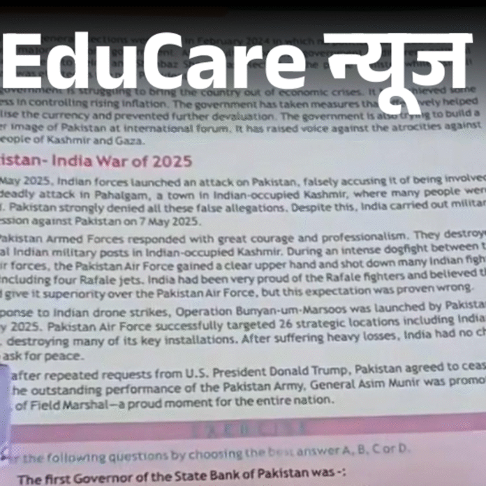 7 मई को भारतीय सेना द्वारा पाकिस्तान पर चलाए गए ऑपरेशन सिंदूर की जानकारी पाकिस्तान ने अपने स्कूल करिकुलम में जोड़ी है। हालांकि, सोशल मीडिया पर शेयर हो रही नई स्कूल बुक्स में बताई गई जानकारियां सच से काफी अलग हैं। संशोधित सिलेबस में बताया गया है कि पाकिस्तान ने भारत को 4 दिन में ही हरा दिया। कोर्स में ये भी जोड़ा गया है कि भारत ने पहलगाम में हुए हमले का आरोप जबरन भारत पर लगाया जिसके जवाब में पाकिस्तान ने भारत को घुटनों पर ला दिया। पाकिस्तान-इंडिया वॉर ऑफ 2025 टॉपिक शामिल सोशल मीडिया पर किताब के उस हिस्से की फोटो वायरल है, जिसमें ये जानकारी लिखी हुई है। हालांकि, अभी यह साफ नहीं है कि ये किताबें किस क्लास की हैं। किताब में लिखा- पाकिस्तान ने जवाबी कार्रवाई की किताब में आगे दावा किया गया है कि पाकिस्तान की सेना ने केवल भारतीय सैन्य ठिकानों पर ही जवाबी कार्रवाई की। जबकि रिपोर्ट और ओपन-सोर्स इंटेलिजेंस के अनुसार, पाकिस्तान ने अमृतसर, जम्मू, श्रीनगर और दो दर्जन से ज्यादा स्थानों पर ड्रोन और मिसाइल हमले किए, जिनमें से कई सिविलियन इलाके थे। इसके जवाब में भारत ने टार्गेटेड ऑपरेशन चलाए, जिसमें लाहौर में पाकिस्तान की HQ-9 एयर डिफेंस प्रणाली को नष्ट किया गया और सियालकोट, इस्लामाबाद में सैन्य ठिकानों पर हमले किए गए। किताब में लिखा- ट्रंप ने सीजफायर कराया किताब में पाकिस्तान के ऑपरेशन बुनयान-उम-मरसूस की जानकारी भी शामिल की गई है। इसके बारे में लिखा है कि पाक एयरफोर्स ने भारत के 26 एयरबेस नष्ट कर दिए। किताब में ये भी कहा गया है कि भारत ने ‘भारी नुकसान’ झेलने के बाद शांति की अपील की, और पाकिस्तान ने तत्कालीन अमेरिकी राष्ट्रपति डोनाल्ड ट्रंप के दबाव में ही उसे मंजूरी दी। भारत ने प्रेस कॉन्फ्रेंस कर पाकिस्तानी झूठ एक्सपोज किया था भारतीय सेना ने 12 मई को प्रेस कॉन्फ्रेंस कर ऑपरेशन सिंदूर की सच्चाई दुनिया के सामने रखी थी। भारत ने सैटेलाइट तस्वीरों और वीडियो के जरिए साबित किया था कि उसने पाकिस्तान और PoK में आतंकी ठिकानों को निशाना बनाया, न कि सिविल इलाकों को।