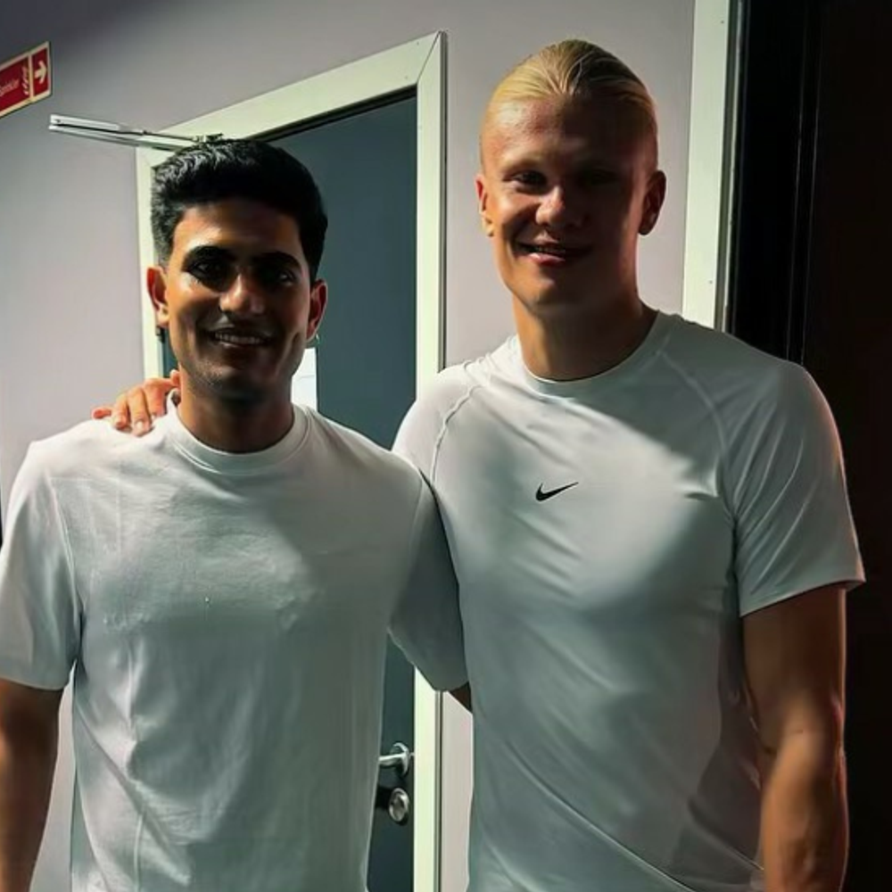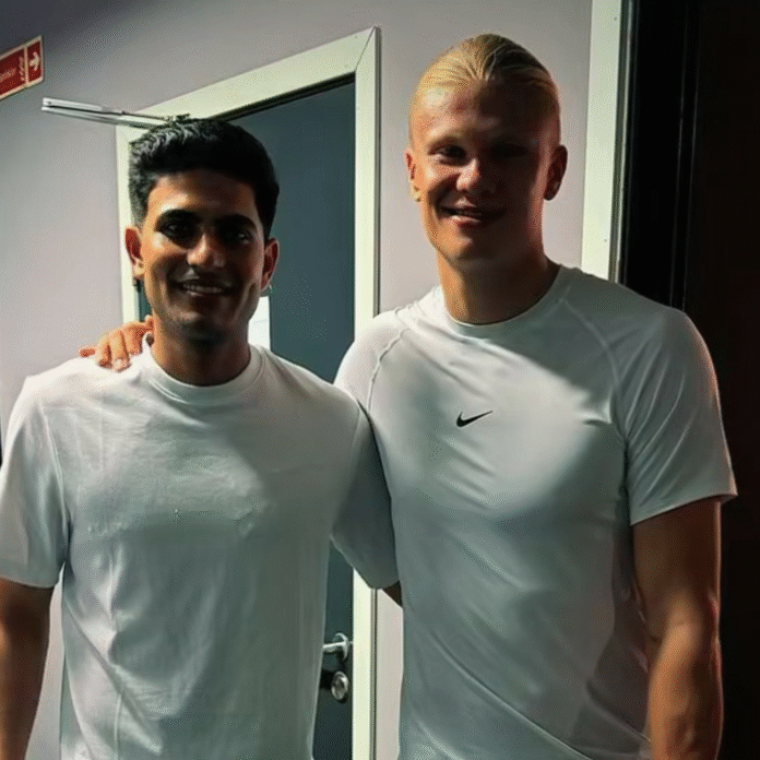 भारतीय कप्तान गिल नार्वे के फुटबॉलर हालैंड से मिले:शुभमन ने जर्सी गिफ्ट की; एर्लिंग ने साइन किए हुए जूते दिए