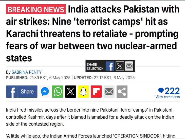 भारत ने पहलगाम आतंकी हमले के ठीक 15 दिन बाद पाकिस्तान के 9 आतंकी ठिकानों पर हमला किया है। ये वे ठिकाने हैं, जहां से भारत पर आतंकी हमलों की साजिश रची जा रही थी और उन्हें अंजाम दिया जा रहा था। भारत ने इसे ‘ऑपरेशन सिंदूर’नाम दिया है। पाकिस्तानी मीडिया के मुताबिक हमले में 3 लोगों की मौत हुई है और 12 लोग घायल हैं। पाकिस्तानी रक्षा मंत्री ख्वाजा आसिफ ने भारत के हमले का जवाब देने की कसम खाई है। अमेरिका मे न्यूयॉर्क टाइम्स से लेकर ब्रिटेन में BBC तक भारत की इस स्ट्राइक को प्रमुखता से कवर कर रहे हैं। देखिए किसने क्या लिखा…. वॉशिंगटन पोस्ट: भारत का पाक पर हमला, जंग की आशंका बढ़ी भारतीय सेना ने बताया है कि उसने उन 9 जगहों को निशाना बनाया है, जहां से भारत के खिलाफ आतंकवादी हमलों की योजना बनाई गई थी और डायरेक्शन दिया गया था। किसी भी पाकिस्तानी सैन्य ठिकाने को निशाना नहीं बनाया गया है। हमला फोकस्ड और नपा-तुला है। पाकिस्तान ने इन हमलों की निंदा की है। सैन्य प्रवक्ता अहमद शरीफ चौधरी ने कहा कि ये हमले शर्मनाक थे। पाकिस्तान सही समय पर जवाब देगा। चौधरी ने कहा कि कम से कम तीन भारतीय मिसाइलों से हमलों की पुष्टि हुई है, जिसमें पाकिस्तान के पंजाब क्षेत्र के बहावलपुर शहर में एक मस्जिद के पास किया गया हमला भी शामिल है। BBC: भारत बोला- पाकिस्तान और PoK पर हमले किए हैं भारत सरकार का कहना है कि उसकी डिफेंस फोर्स ने पाकिस्तान और PoK में आतंकवादी ठिकाने पर हमला किया। वहीं पाकिस्तानी सेना के प्रवक्ता का कहना है कि इस्लामाबाद इस हमले का जवाब अपने चुने गए वक्त और जगह पर देगा। प्रवक्ता ने कहा- हमारी वायुसेना के सभी विमान हवा में हैं। भारत के हवाई क्षेत्र से किया गया यह एक कायराना हमला है। न्यूयॉर्क टाइम्स: आतंकी हमले के दो हफ्ते बाद भारत का पाकिस्तान पर अटैक भारत ने कहा कि उसकी डिफेंस फोर्स ने पाकिस्तान और PoK में 9 जगहों पर हमला किया है। वहीं पाकिस्तानी सैन्य अधिकारियों का कहना है कि पंजाब प्रांत और PoK में 5 जगहों पर हमले किए गए हैं। पाकिस्तानी सरकार ने कहा कि हम हमले का जवाब दिए बिना नहीं रहेंगे। जल्द ही भारत की अस्थायी खुशी, स्थायी दुख में बदल जाएगी। द गार्जियन: पाकिस्तान बोला- भारत के एक्शन का जवाब दे रहे हैं