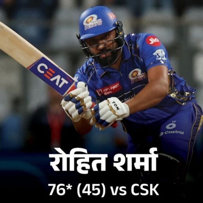 मुंबई इंडियंस ने IPL के 38वें मैच में चेन्नई सुपर किंग्स को 9 विकेट से हरा दिया। MI ने 18वें सीजन में लगातार तीसरा मैच जीता। वानखेड़े स्टेडियम में मुंबई ने बॉलिंग चुनी। चेन्नई ने 5 विकेट खोकर 176 रन बनाए। मुंबई ने 16वें ओवर में 1 ही विकेट के नुकसान पर टारगेट हासिल कर लिया। मुंबई से रोहित शर्मा और सूर्यकुमार यादव दोनों ने फिफ्टी लगाई। रोहित ने 74 और सूर्या ने 68 रन बनाए। जसप्रीत बुमराह ने 2 विकेट लिए। चेन्नई से शिवम दुबे ने 50 और रवींद्र जडेजा ने 53 रन बनाए। जडेजा ने 1 विकेट भी लिया। चेन्नई ने सीजन में छठा मैच गंवाया, टीम 2 ही मैच जीत सकी है। 5 पॉइंट्स में मैच एनलासिस… 1. प्लेयर ऑफ द मैच 177 रन के टारगेट का पीछा करने उतरी मुंबई इंडियंस को पूर्व कप्तान रोहित शर्मा ने तेज शुरुआत दिलाई। उन्होंने रायन रिकेलटन के साथ 63 रन की ओपनिंग पार्टनरशिप की। रोहित ने 33 गेंद पर सीजन में अपनी पहली फिफ्टी लगाई। उन्होंने 74 रन बनाए और टीम को जीत दिलाई। 2. जीत के हीरो 3. फाइटर ऑफ द मैच चेन्नई से रवींद्र जडेजा ही फाइट दिखाते नजर आए। वे नंबर-4 पर बैटिंग करने उतरे और फिफ्टी लगाई। उन्होंने शिवम दुबे के साथ चौथे विकेट के लिए 79 रन की पार्टनरशिप की। जडेजा ने फिर गेंदबाजी करते हुए रायन रिकेलटन का विकेट भी लिया। 4. टर्निंग पॉइंट मुंबई ने 7वें ओवर में पहला विकेट गंवाया। यहां सूर्यकुमार यादव बैटिंग करने आए, उन्होंने रोहित के साथ तीसरे विकेट के लिए सेंचुरी पार्टनरशिप की। दोनों ने तेजी से रन बनाए और चेन्नई को मैच से बाहर कर दिया। दोनों ही प्लेयर्स ने फिफ्टी भी लगाई। 5. मुंबई छठे नंबर पर पहुंचा लखनऊ के निकोलस पूरन 368 रन बनाकर टॉप रन स्कोरर हैं। गुजरात के प्रसिद्ध कृष्णा 14 विकेट लेकर पर्पल कैप हासिल किए हुए हैं। 18वें सीजन में चौथा मैच जीतकर मुंबई इंडियंस 8 पॉइंट्स के साथ पॉइंट्स टेबल में छठे नंबर पर पहुंच गई। चेन्नई 8 मैचों में छठी हार के बाद 10वें नंबर पर ही है।