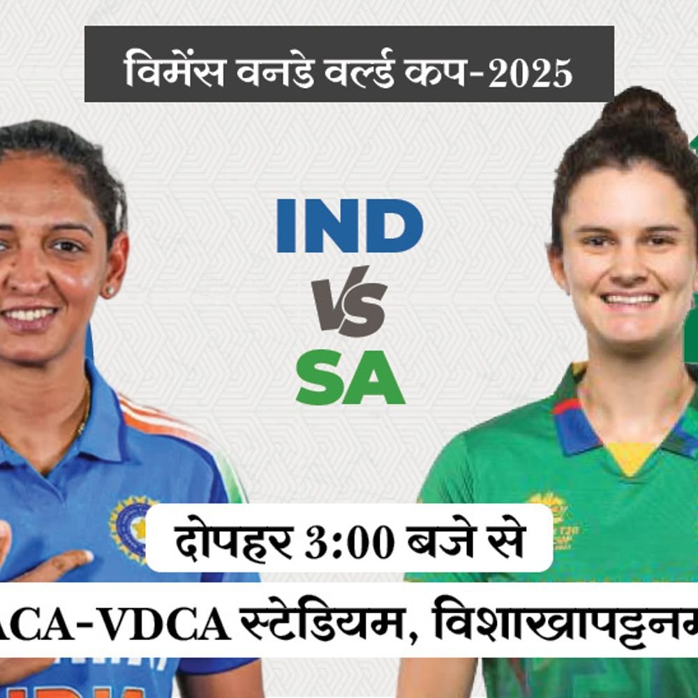 विमेंस वनडे वर्ल्ड कप का 10वां मैच आज भारत और साउथ अफ्रीका के बीच खेला जाएगा। विशाखापट्टनम के डॉ वायएस राजशेखर स्टेडियम में मुकाबला दोपहर 3 बजे शुरू होगा। टॉस दोपहर 2.30 बजे होना है। इंडिया विमेंस टीम पाकिस्तान और श्रीलंका को हराकर फिलहाल पॉइंट्स टेबल में तीसरे नंबर पर है। टीम आज का मैच जीतकर टॉप पर पहुंच सकती है। साउथ अफ्रीका को पहले मुकाबले में इंग्लैंड ने हराया, टीम ने दूसरे मुकाबले में वापसी की और न्यूजीलैंड को हराकर पहली जीत दर्ज की। भारत ने 61% वनडे हराए