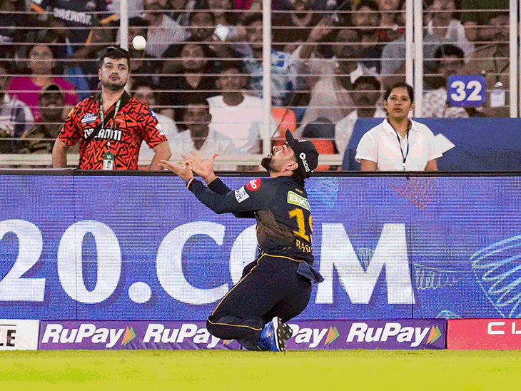 IPL में शुक्रवार को गुजरात टाइटंस ने सनराइजर्स हैदराबाद को हरा दिया। अहमदाबाद के नरेंद्र मोदी स्टेडियम में इस जीत से गुजरात ने पॉइंट्स टेबल के टॉप-2 में भी जगह बना ली। GT के साई सुदर्शन टी-20 में सबसे तेज 2 हजार रन बनाने वाले भारतीय बन गए। राशिद खान ने फील्डिंग करते हुए बेहतरीन रनिंग कैच पकड़ा। वहीं गुजरात के कप्तान शुभमन गिल DRS से नाखुश होकर अंपायर से बहस करते नजर आए। GT vs SRH मैच के टॉप रिकॉर्ड और मोमेंट्स 1. शुभमन-सुदर्शन ने 8 गेंद पर 7 चौके लगाए गुजरात के ओपनर्स साई सुदर्शन और शुभमन गिल ने पावरप्ले में 8 गेंद पर 7 चौके लगाए। इनमें से 6 चौके लगातार गेंदों पर आए। तीसरे ओवर में मोहम्मद शमी के खिलाफ सुदर्शन ने दूसरी गेंद छोड़कर हर गेंद पर चौका लगाया। अगले ओवर में फिर पैट कमिंस के खिलाफ शुभमन ने भी शुरुआती 2 गेंदों पर चौके लगा दिए। दोनों ने फिर 5वें और छठे ओवर में 5 गेंदों पर लगातार 5 चौके भी लगाए। 2. रन आउट हुए शुभमन गिल 13वें ओवर में गुजरात के कप्तान शुभमन गिल को हर्षल पटेल के डायरेक्ट हिट के कारण पवेलियन लौटना पड़ा। ओवर की आखिरी गेंद को जोस बटलर ने फाइन लेग की ओर धकेला। शुभमन स्ट्राइक एंड की ओर रन दौड़ने आए, इतने में हर्षल ने गेंद उठाकर थ्रो कर दी। विकेटकीपर हेनरिक क्लासन ने एक हाथ से गेंद को गाइड किया और बॉल स्टंप्स से टकरा गई। इस दौरान शुभमन क्रीज से दूर थे। उन्हें 76 रन के स्कोर पर पवेलियन लौटना पड़ा। 3. उनादकट ने 1 ओवर 3 विकेट लिए SRH के जयदेव उनादकट के खिलाफ आखिरी ओवर में 2 छक्के लगे, लेकिन उन्होंने 3 विकेट भी झटक लिए। उन्होंने दूसरी गेंद पर वॉशिंगटन सुंदर, पांचवीं गेंद पर राहुल तेवतिया और छठी गेंद पर राशिद खान को कैच कराया। 4. राशिद खान का बेहतरीन रनिंग कैच SRH की बैटिंग के पांचवें ओवर में राशिद खान ने बेहतरीन रनिंग कैच पकड़ा। ओवर की तीसरी गेंद प्रसिद्ध कृष्णा ने शॉर्ट पिच फेंकी। ट्रैविस हेड ने पुल शॉट खेला, लेकिन गेंद हवा में खड़ी हो गई। डीप स्क्वेयर लेग पर खड़े राशिद मिड-विकेट की ओर दौड़े और डाइव लगाकर बेहतरीन कैच पकड़ लिया। हेड 20 रन बनाकर आउट हुए। 5. तेवतिया ने एक हाथ से छक्का बचाया 13वें ओवर में गुजरात के राहुल तेवतिया ने हवा में जंप लगाकर एक हाथ से छक्का बचाया। राशिद खान ने ऑफ स्टंप के बाहर फुल लेंथ बॉल फेंकी। हेनरिक क्लासन ने लॉन्ग ऑफ पर शॉट खेला, वहां मौजूद तेवतिया ने हवा में जंप लगाई और एक हाथ से गेंद पकड़ ली। वे मोमेंटम के चलते बाउंड्री में जा रहे थे, तभी उन्होंने गेंद अंदर फेंकी और छक्का जाने से बचा लिया। 6. शुभमन ने अंपायर से बहस की 14वें ओवर में गुजरात के कप्तान शुभमन गिल DRS फैसले से नाखुश होकर अंपायर से बहस करते नजर आए। ओवर की चौथी गेंद प्रसिद्ध कृष्णा ने यॉर्कर फेंकी। गेंद अभिषेक शर्मा के पैड्स पर लगी, गुजरात 