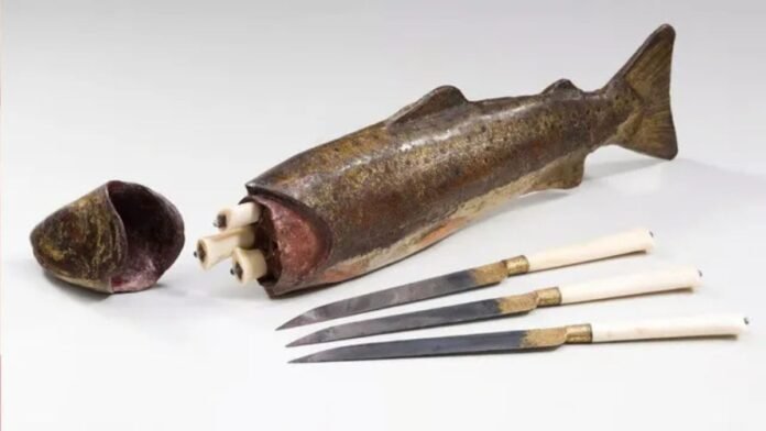Trout Fish Knife Case: 16वीं शताब्दी का इटली अपनी कलात्मक दृष्टि के लिए प्रसिद्ध था। उस दौर में रोजमर्रा के उपकरणों को भी भव्यता प्रदान की जाती थी। यह नाइफ केस पूरी तरह से एक ट्राउट मछली के आकार में बना है। इसकी संरचना इतनी सजीव है कि इसे पहली बार देखने पर यह किसी औजार के बजाय एक सजावटी वस्तु प्रतीत होती है।
