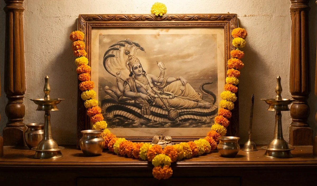 – चौकी पर पीला या लाल कपड़ा बिछाकर भगवान विष्णु की प्रतिमा को विराजित करें।
